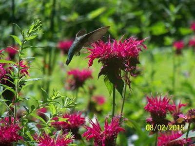 Can you see her feeding on the Monarda. Center of the photo with her long bill spearing a blossom.