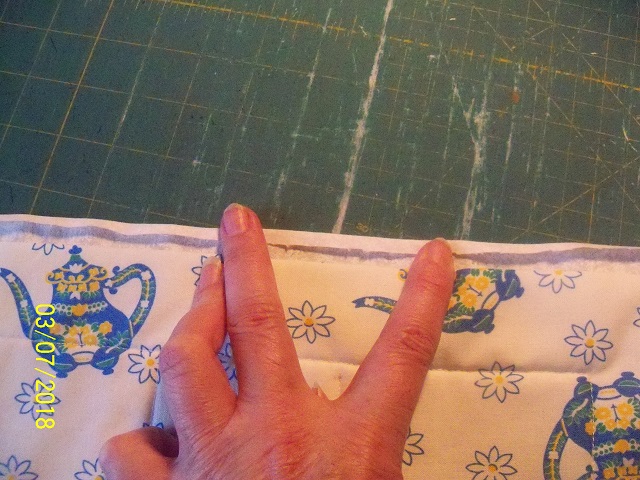 Here's another view. Press that folded bit down evenly end to end. I do the two side pieces first. Pressing gives you a nice creased edge easy to fold over later.